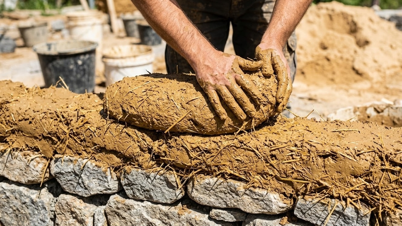 A preparação da argamassa é a etapa mais crítica de toda a obra. A mistura precisa atingir uma consistência plástica perfeita, semelhante a uma argila firme que possa ser moldada sem escorrer pelas laterais. Historicamente, essa etapa pesada era feita pisando descalço sobre a massa ou com a ajuda de animais de tração.