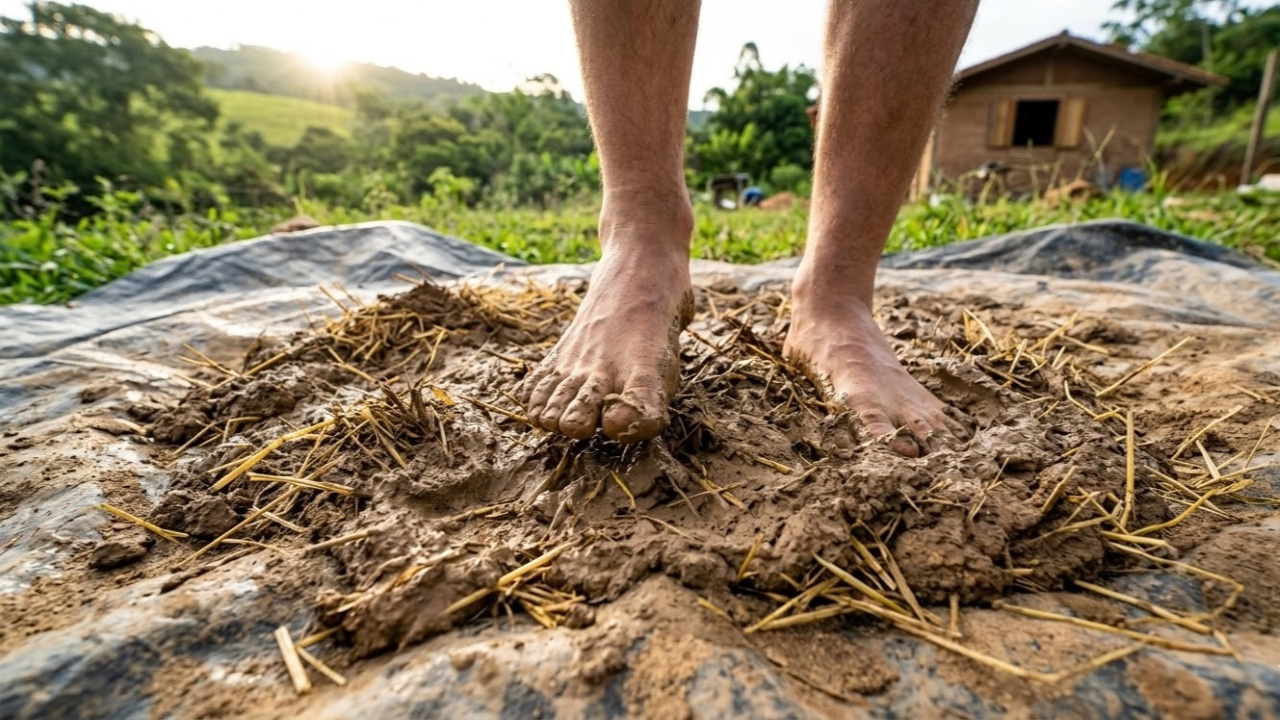 - Palha ou fibras vegetais: Garante a resistência à tração, funcionando exatamente como o vergalhão de aço dentro do concreto.