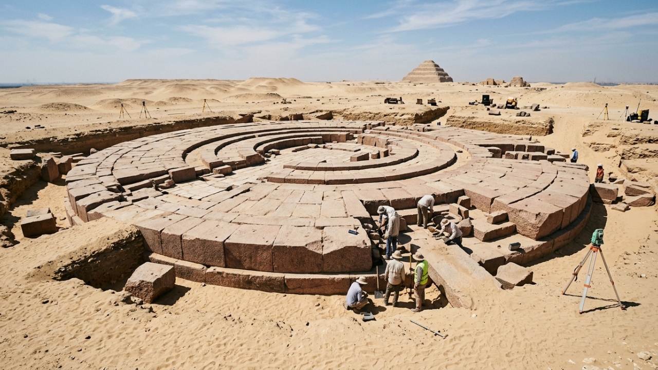 Uma estrutura circular de 50 metros no Egito foi identificada recentemente no deserto de Saqqara por equipes internacionais de arqueologia. Esse achado arqueológico apresenta blocos de granito de 10 toneladas e sugere métodos de corte por abrasão avançados para o período histórico.