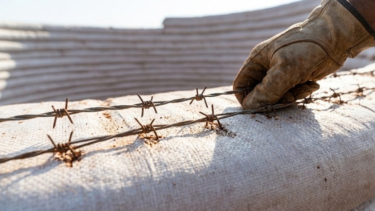 A estabilidade vem de dois fatores principais: a compactação intensa e a amarração mecânica. Entre uma fiada e outra, a família esticou fios metálicos sobre os sacos já compactados. Quando a próxima camada foi colocada, o fio ficou prensado, travando todo o conjunto e impedindo deslizamentos.