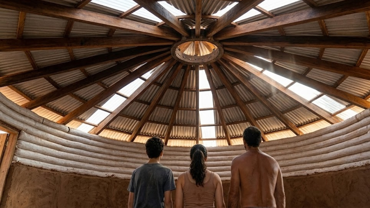 Quando as paredes chegaram à altura desejada, a família apoiou vigas de madeira sobre o topo da estrutura circular. As vigas partiram do centro em direção às bordas, criando a inclinação necessária para o escoamento da água.