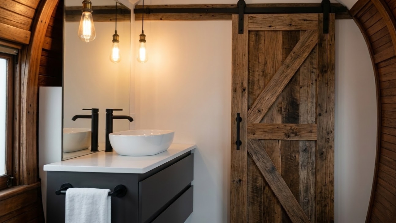 - Banheiro de luxo: Construído com porta estilo celeiro e acabamentos modernos.