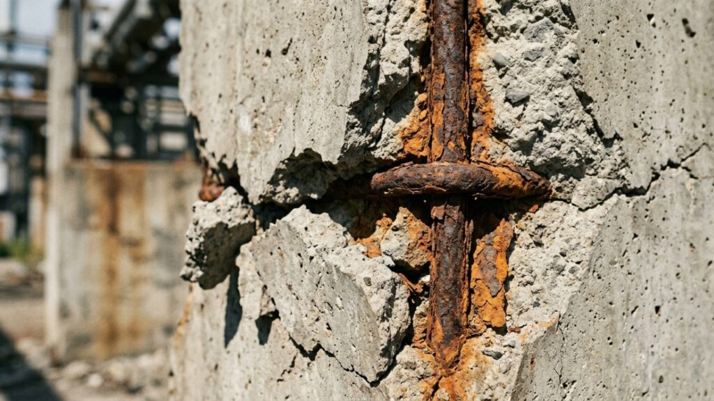 O concreto moderno depende de barras de aço (armaduras) para ganhar resistência à tração. O problema começa quando a água penetra por microfissuras, atinge o aço e provoca oxidação. O ferro enferrujado expande, gera tensão interna e causa o lascamento do material de dentro para fora, processo chamado de spalling.