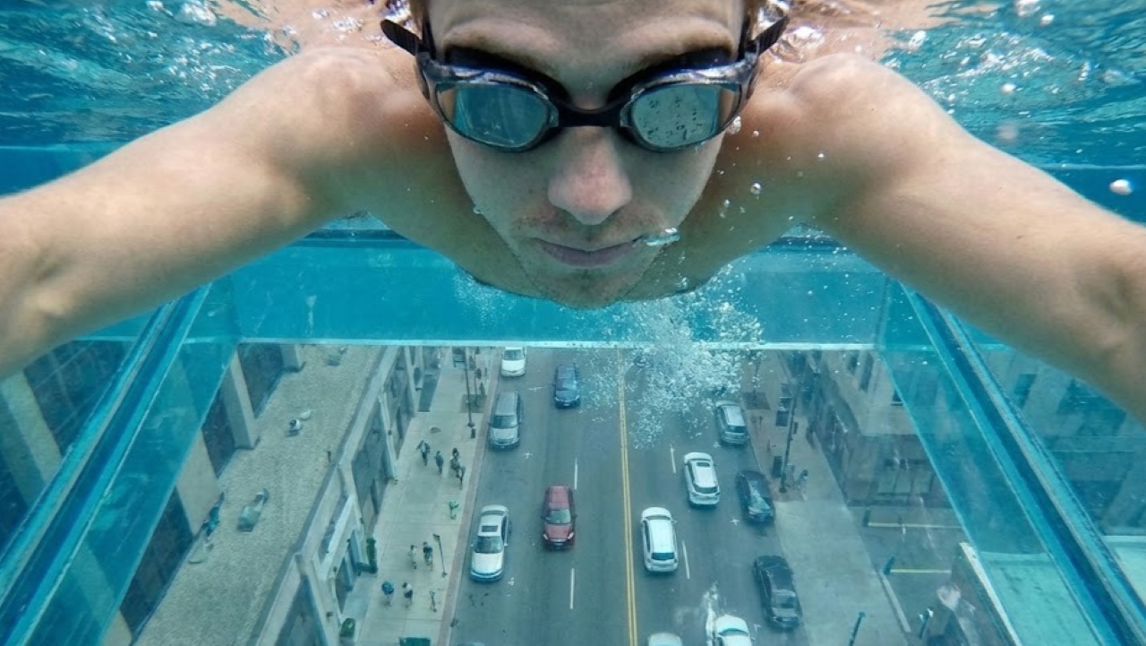 Nadando no céu: a primeira piscina de vidro suspensa entre dois prédios a 35 metros de altura que dá a sensação vertiginosa de voar