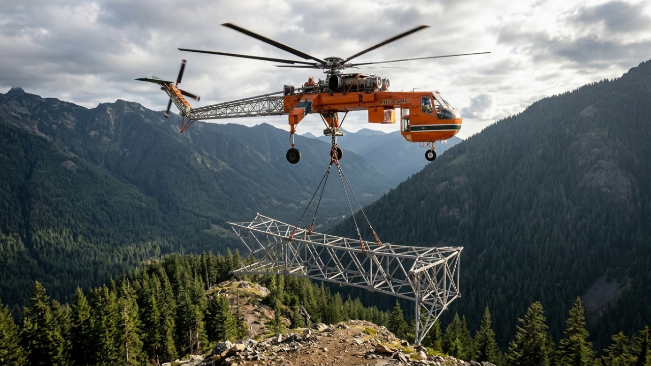 A carga máxima de 9.070 kg em suspensão externa é o dado técnico. O que impressiona é o contexto de uso. Em construção de infraestrutura elétrica, o S-64 posiciona torres de transmissão de alta tensão em terrenos montanhosos inacessíveis a qualquer equipamento terrestre. Uma operação que, com guindastes convencionais, exigiria abertura de estradas e semanas de trabalho, é concluída em minutos.