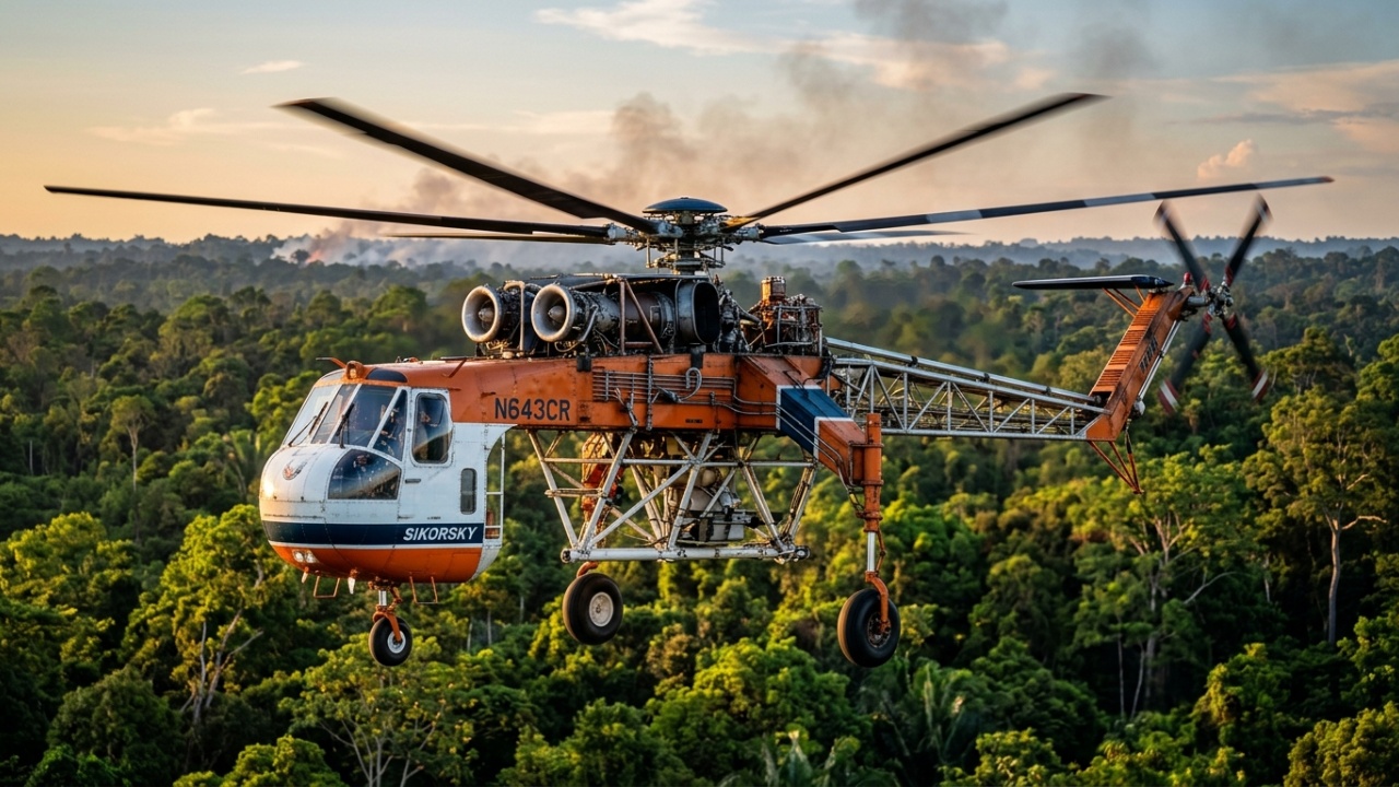 À primeira vista, ele parece inacabado. Não tem fuselagem traseira, não tem barriga: é basicamente um cockpit suspenso por um rotor gigante, com duas vigas metálicas onde deveria estar o corpo da aeronave. Mas esse design aparentemente absurdo é exatamente o que faz do Sikorsky S-64 Skycrane um dos helicópteros mais eficazes já criados para o combate a incêndios florestais.