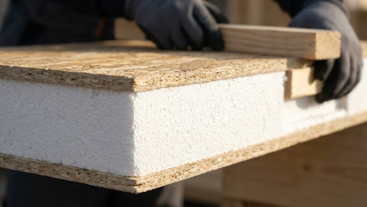 Os painéis SIP são elementos pré-fabricados compostos por duas chapas estruturais externas, geralmente de OSB (placas de madeira orientada), e um núcleo interno isolante, feito de EPS (poliestireno expandido) ou poliuretano rígido. Essa combinação transforma cada painel em um componente estrutural completo, que já chega ao canteiro pronto para montagem, com recortes precisos para portas, janelas e passagens de instalações.