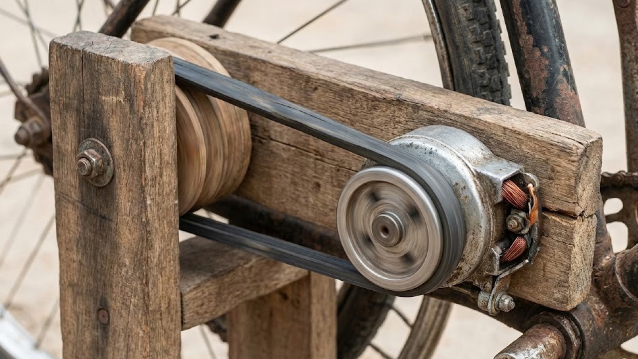 Esse eixo transmitia o movimento para um gerador adaptado a partir de um motor de bicicleta, um dos poucos componentes que William conseguiu encontrar em ferro-velho. A rotação fazia o gerador produzir energia por indução eletromagnética, permitindo carregar uma bateria de 12 volts.