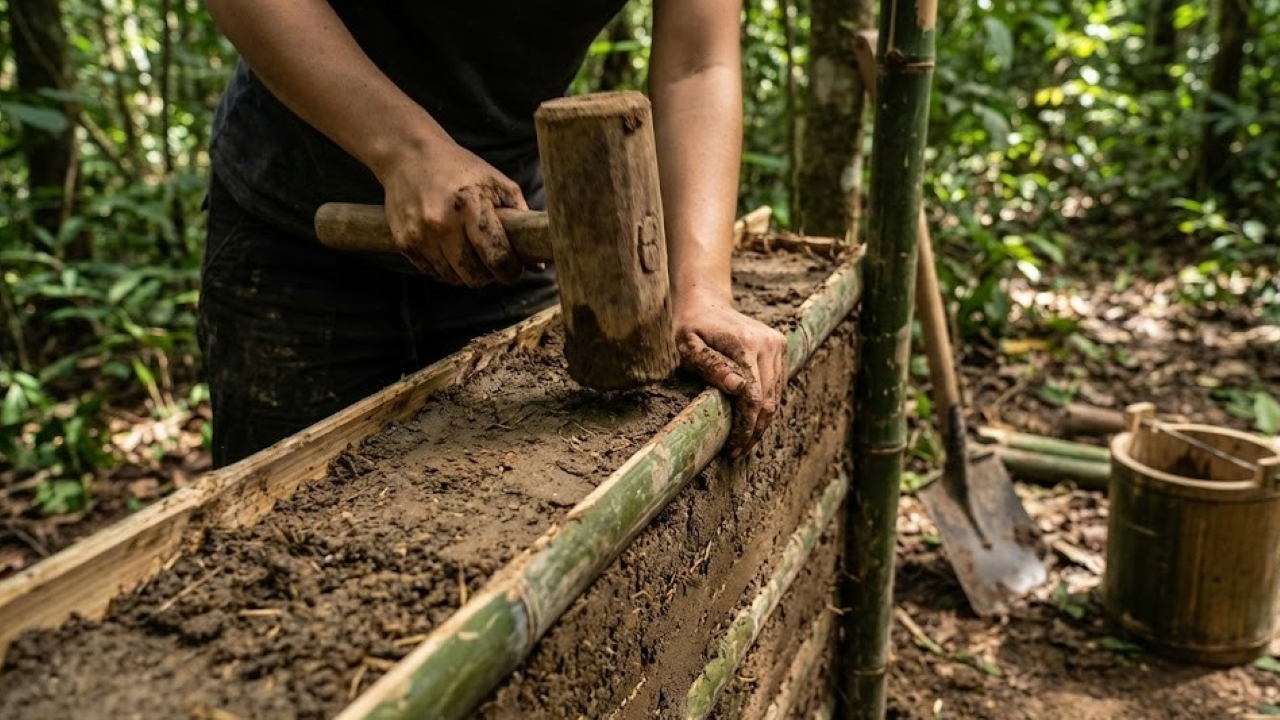 A construção envolveu fundação, paredes e estrutura do telhado, todos realizados manualmente. Chuyên utilizou terra crua compactada, bambu e pedras, combinando resistência e estética natural. Cada etapa foi planejada para integrar os ambientes à paisagem ao redor, mantendo simplicidade e durabilidade. A terra para as paredes foi retirada do próprio terreno, reduzindo custos e impacto ambiental.