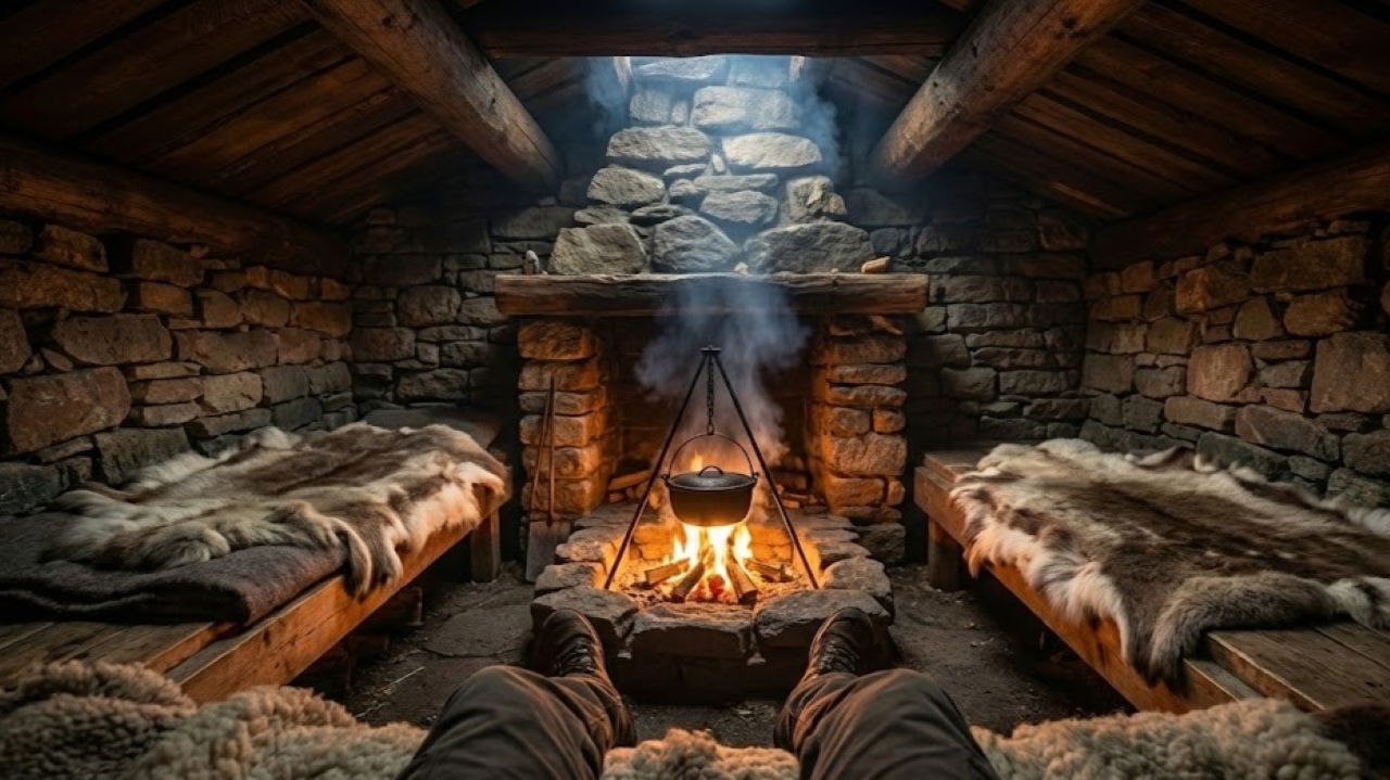 O abrigo se define pela rusticidade e pelo uso de materiais em estado bruto. A fachada combina pedras naturais com um telhado de madeira de reflorestamento ou galhos caídos. Não há divisórias rígidas: os ambientes são integrados para maximizar a circulação de calor gerado pela fogueira interna.
