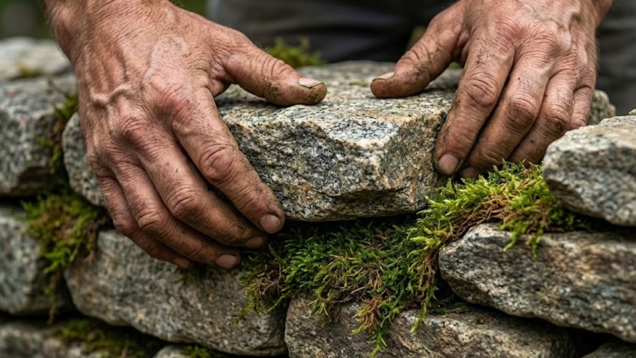 - Estruturação das paredes de pedra: assentar as rochas de forma estável, criando nichos e proteções naturais.