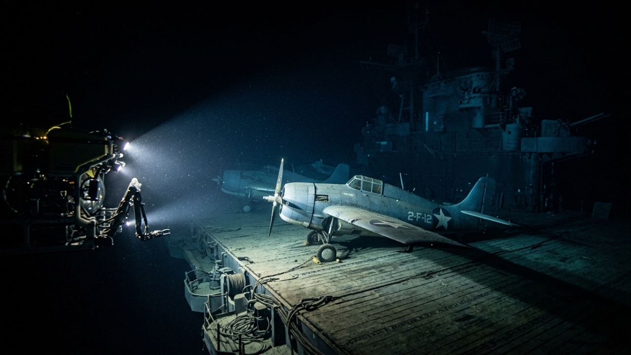Um submersível robótico localizou o porta-aviões afundado USS Hornet a 4.000 metros de profundidade no Oceano Pacífico em 2026. A missão capturou imagens nítidas de caças F4F Wildcat que repousam intactos no convés da embarcação militar de forma fantasmagórica.