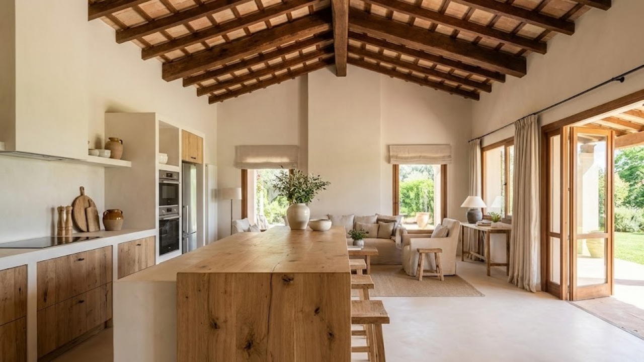 A planta foi desenhada para promover a convivência. A sala de estar se integra à cozinha por meio de um balcão rústico, criando um ambiente único e arejado. O layout prioriza a circulação de ar cruzada, essencial para manter o frescor nos dias quentes de campo.