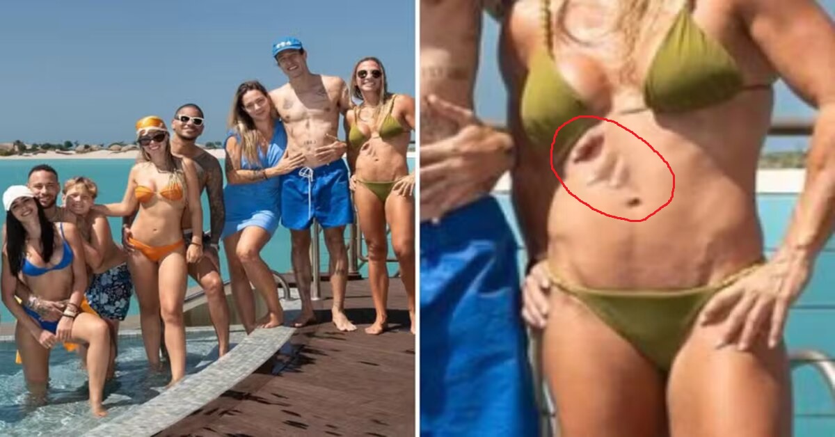 Na imagem, Neymar estava acompanhado de amigos e familiares. Tudo parecia normal, até que um detalhe peculiar apareceu. Paula Akkari, amiga do jogador e esposa do famoso jogador de pôquer André Akkari, apareceu na foto com uma “terceira mão” repousando em sua barriga, sem que a origem dessa mão fosse identificada.