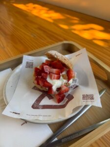 As sobremesas ocupam um papel relevante no menu, com destaque para o bolo de matcha, ingrediente amplamente utilizado na confeitaria japonesa. O uso do matcha também se estende às bebidas, que aparecem em diferentes variações no cardápio, permitindo escolhas que vão além do café tradicional. A variedade de preparações com o ingrediente atende a um público interessado em sabores menos convencionais.
