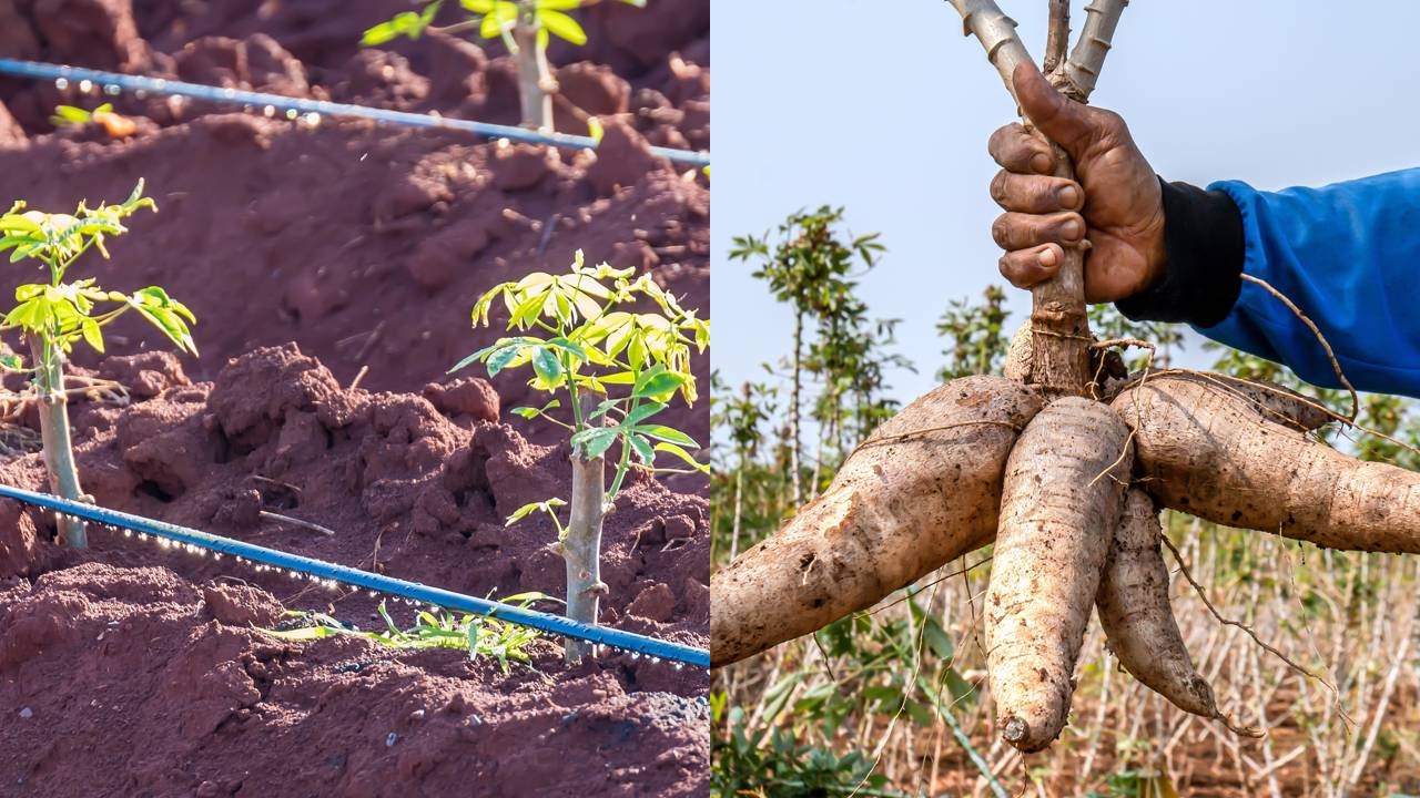 Planta jovem de mandioca no campo e Mandioca na mão, tapioca na mão do agricultor na época da colheita, plantação de mandioca - Créditos: depositphotos.com / cgdeaw - Créditos: depositphotos.com / Bubbers