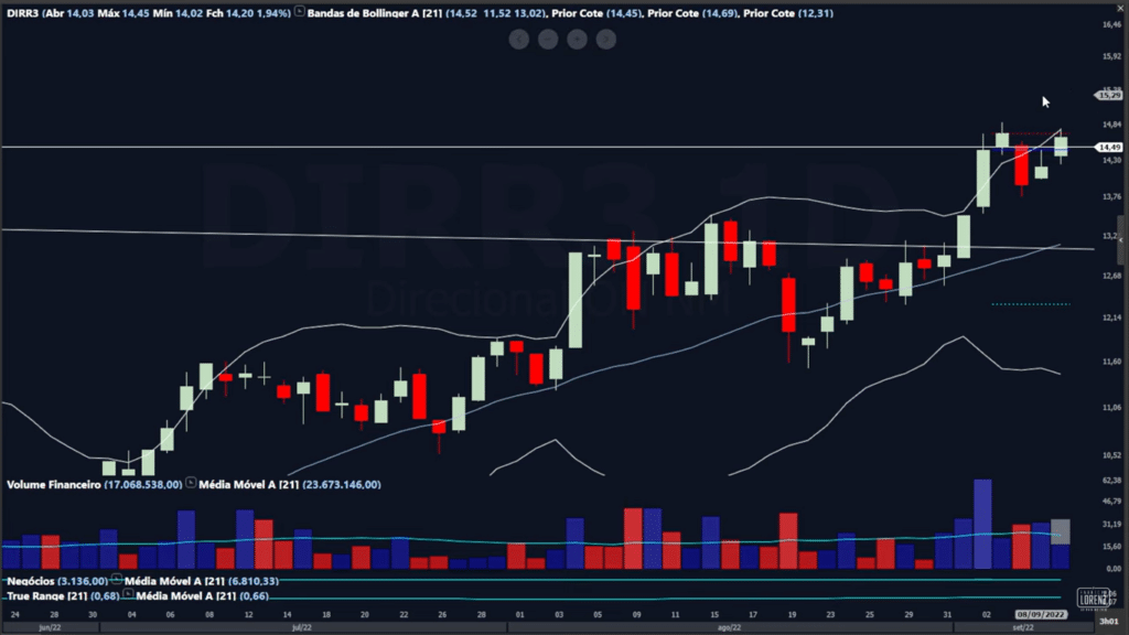 Lorenz destacou que, de modo geral, o setor imobiliário “está fantástico para investir”. Nesse sentido, o analista técnico afirmou que o DIRR3 está muito forte no mercado.