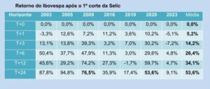 O levantamento da MSX analisa o desempenho do Ibovespa após o primeiro corte da Selic em ciclos anteriores — como 2003, 2005, 2009, 2016, 2019, 2020 e 2023 — e aponta uma tendência clara de valorização no médio e longo prazo.