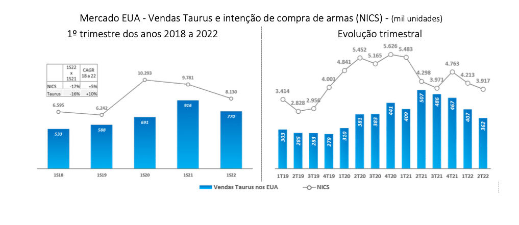 O índice de intenção de compras de armas dos EUA, medido pelo “Adjusted Nics” (National Instant Background Check System) vem mostrando uma desaceleração desde 2020, mas vale lembrar que na comparação de junho deste ano mostra uma alta de 8,1% em relação ao mês anterior, mantendo-se acima da média histórica do setor. A taxa de crescimento composto (CAGR) das vendas da Taurus nos EUA é de 10% ao ano, tomando de conhecimento o primeiro semestre de cada ano entre 2018 a 2022, sendo o dobro do crescimento do NICS, que aponta alta de 5% no período.