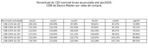 Os dados mostram de forma clara que o retorno efetivo depende diretamente do tempo decorrido entre a compra do CDB e a decretação da liquidação. Um investidor que adquiriu um CDB do Banco Master pagando 120% do CDI em dezembro de 2022, por exemplo, terminará recebendo o equivalente a 115,12% do CDI acumulado até janeiro de 2026, portanto acima do CDI. Já quem fez a mesma aplicação em fevereiro de 2025 receberá o equivalente a 97,92% do CDI, abaixo do próprio CDI, apesar de ter contratado um título que prometia 120%.