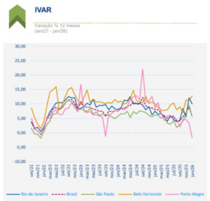 Segundo a última divulgação da FGV, o Índice de Variação de Aluguéis Residenciais (IVAR) de janeiro de 2026 registrou forte alta de 0,65% na sua média, tendo variação positiva em todas as capitais.