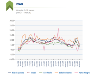 “O IVAR de março de 2026 registrou alta de 0,40%. Com este resultado, a variação acumulada em 12 meses passou de 4,05% em fevereiro para 4,78% em março, confirmando que o mercado de locação residencial segue em trajetória de reajustes, ainda que em ritmo mais moderado do que o observado no pico de dezembro de 2025, quando o acumulado atingiu 8,85%. A manutenção de variações positivas é coerente com o cenário macroeconômico vigente, marcado por juros ainda elevados — a Selic foi reduzida de 15% para 14,75% ao ano apenas em março, após cinco reuniões consecutivas de manutenção.”, avalia Matheus Dias, economista do FGV IBRE.