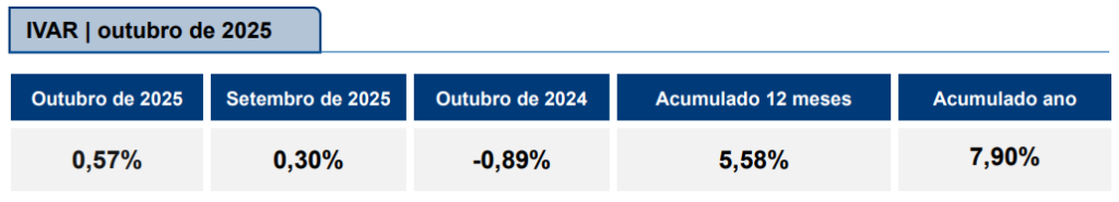 Segundo a última divulgação da FGV, o Índice de Variação de Aluguéis Residenciais (IVAR) de outubro de 2025 registrou forte alta de 0,57%. A variação acumulada em 12 meses mostrou leve desaceleração, saindo de 4,04% em setembro de 2025 para 5,58% em outubro.