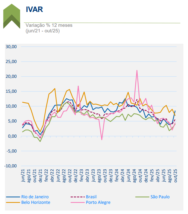 “Entre setembro e outubro de 2025, o IVAR apontou alta mensal em todas as quatro capitais divulgadas. Em Belo Horizonte, os preços avançaram 1,30%, a maior alta entre as capitais analisadas. Em Porto Alegre, os aluguéis subiram 0,88%. Já no Rio de Janeiro, os preços de aluguéis residenciais avançaram 0,68%. A menor taxa de variação foi registrada em São Paulo, que passou de 0,37% para 0,13%.”