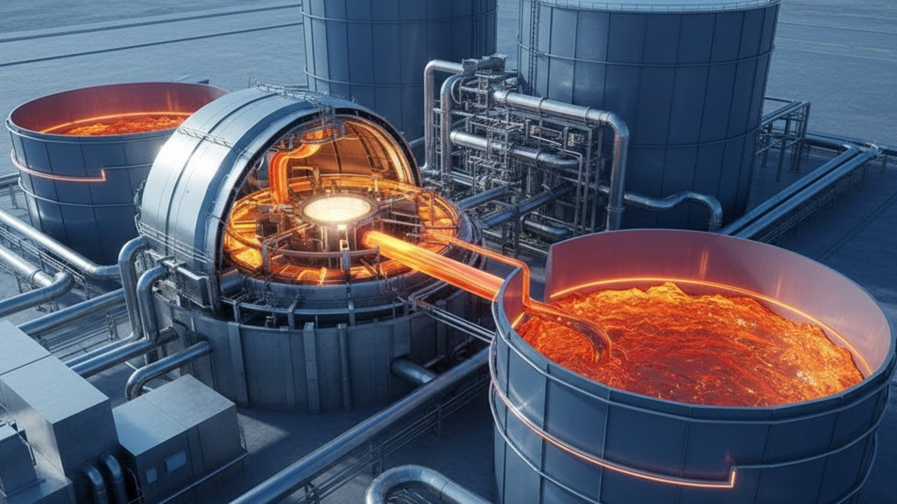 Já o sódio líquido tem um ponto de ebulição de 883 °C. Isso significa que o reator pode operar à pressão atmosférica normal, sem o risco de pressão excessiva. Além disso, o sistema armazena calor em tanques de sal fundido, funcionando como uma bateria térmica gigante.