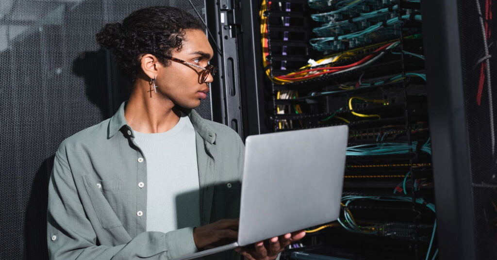 Engenheira segurando laptop enquanto olha para os fios. – Créditos: depositphotos.com / IgorVetushko