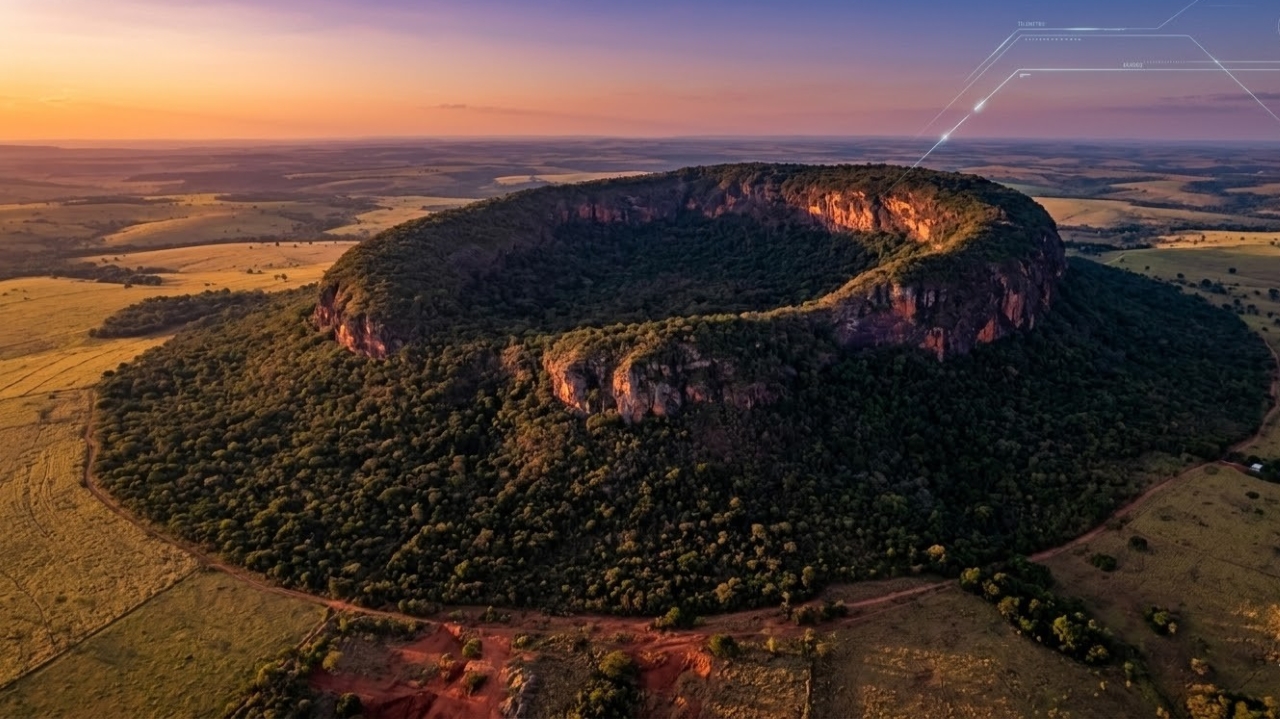 A estrutura que intrigou os cientistas internacionais é um imenso planalto de formato oval que se eleva cerca de 300 metros acima do terreno circundante no Brasil Central. Vista do espaço, a formação assemelha-se a uma ilha de vegetação densa e escura, contrastando fortemente com as áreas de pastagens e campos que caracterizam a região sul goiana.