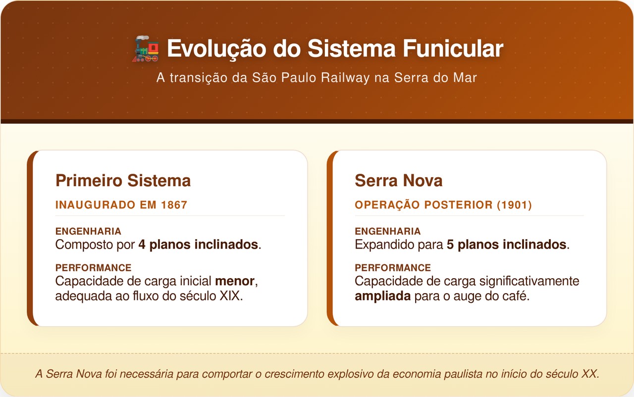 O primeiro sistema entrou em operação em 1867, composto por quatro planos inclinados com máquinas estacionárias a vapor. Anos depois, a chamada Serra Nova ampliou o projeto para cinco patamares, suavizando a subida e aumentando a capacidade de carga.