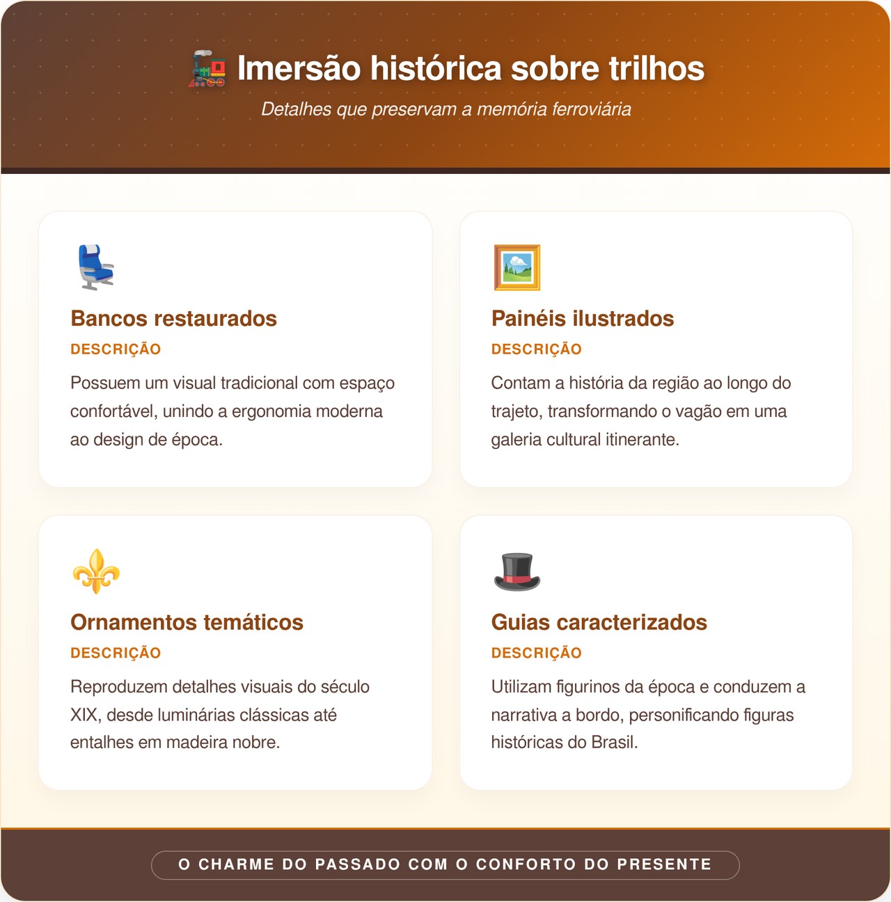 Os vagões foram projetados para misturar conforto moderno com estética antiga, criando um ambiente acessível e envolvente. Veja como cada elemento foi pensado para enriquecer a experiência: