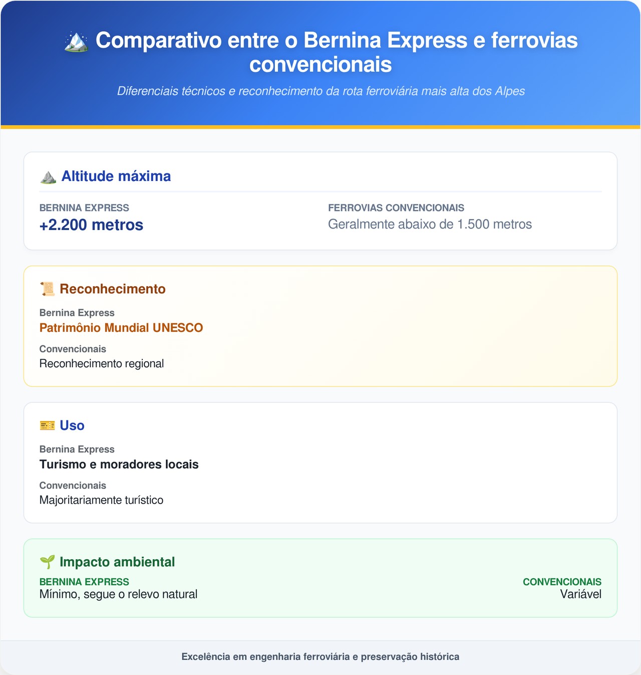 A tabela abaixo resume os principais diferenciais do Bernina Express em relação a outras ferrovias turísticas do mundo: