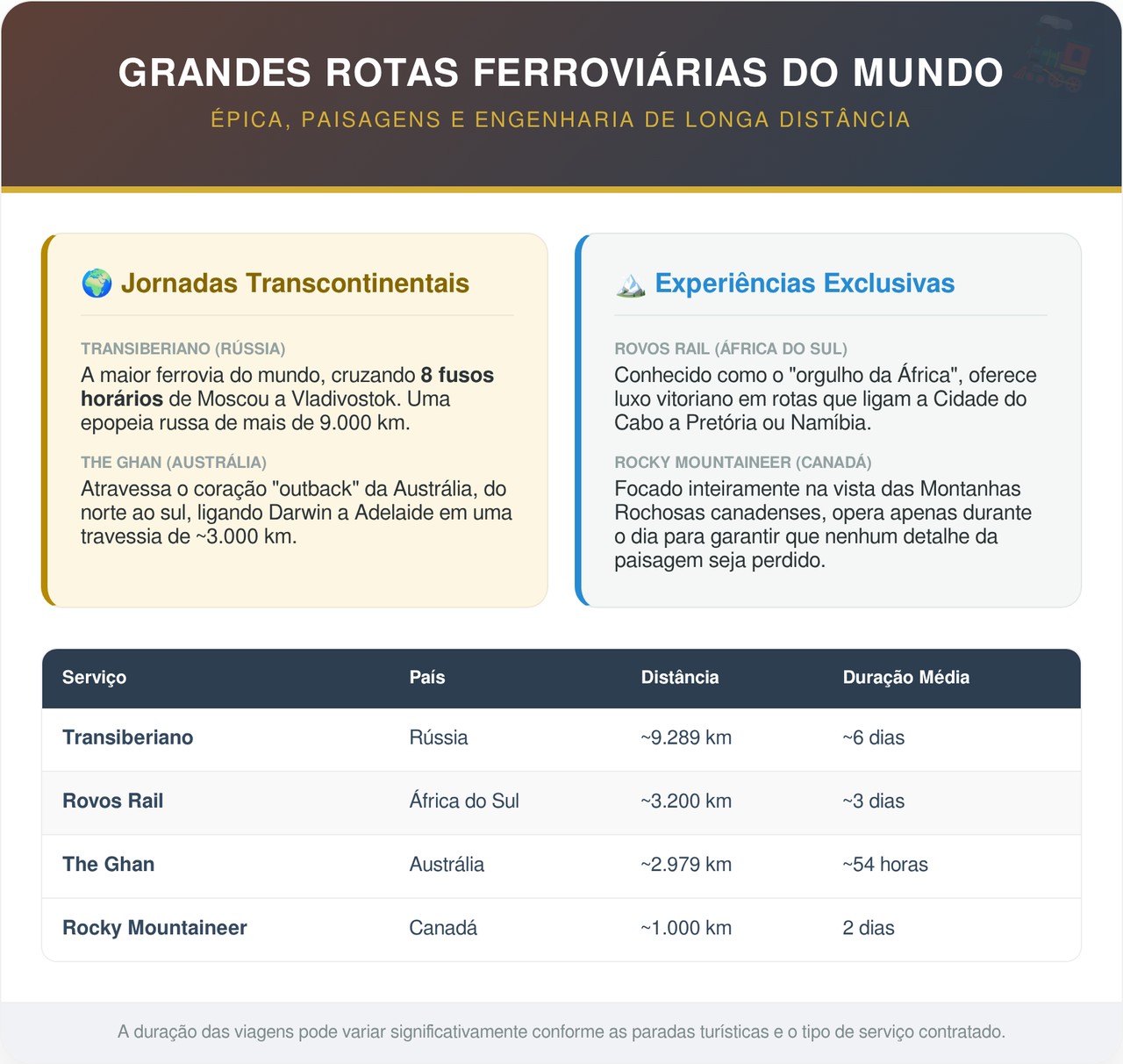 A combinação de distância, isolamento e conforto coloca o The Ghan entre as rotas ferroviárias mais icônicas do mundo. Veja a comparação: