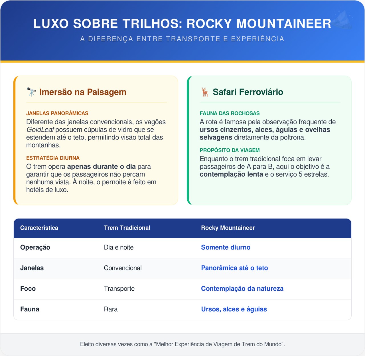 Seu reconhecimento global consolidou o Rocky Mountaineer como referência mundial em turismo ferroviário, provando que uma viagem de trem pode ser tão memorável quanto qualquer destino de chegada.