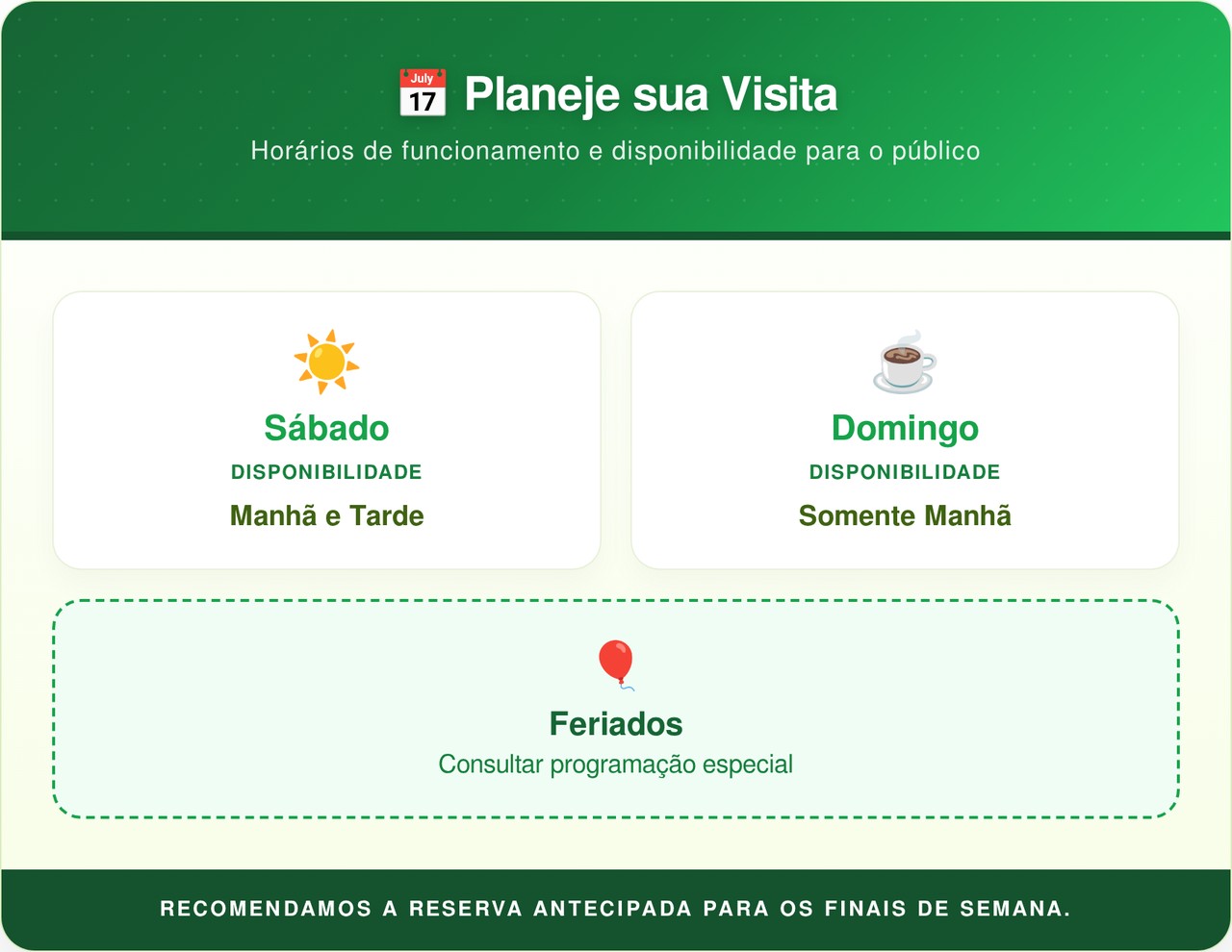 O passeio completo dura cerca de duas horas, incluindo ida, parada e retorno. A programação pode ter variações em feriados e alta temporada, com viagens extras conforme a demanda.
