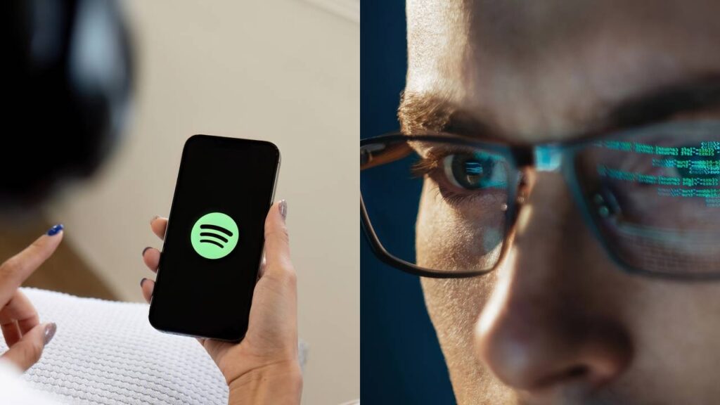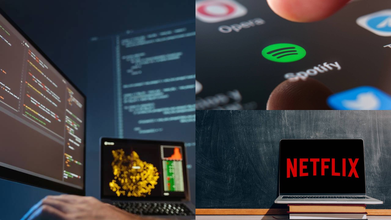Laptop com o site da Netflix sobre uma pilha de livros perto de um quadro-negro, Aplicativo com o logotipo do Spotify na tela de um celular, com um dedo tocando. Serviço global de streaming de música e programador concentrado trabalhando em um computador, escrevendo código para um aplicativo ou design de site em seu escritório em casa para uma empresa de desenvolvimento de software - Créditos: depositphotos.com / AndrewLozovyi - Créditos: depositphotos.com / iwatchwater - Créditos: depositphotos.com / [email protected]