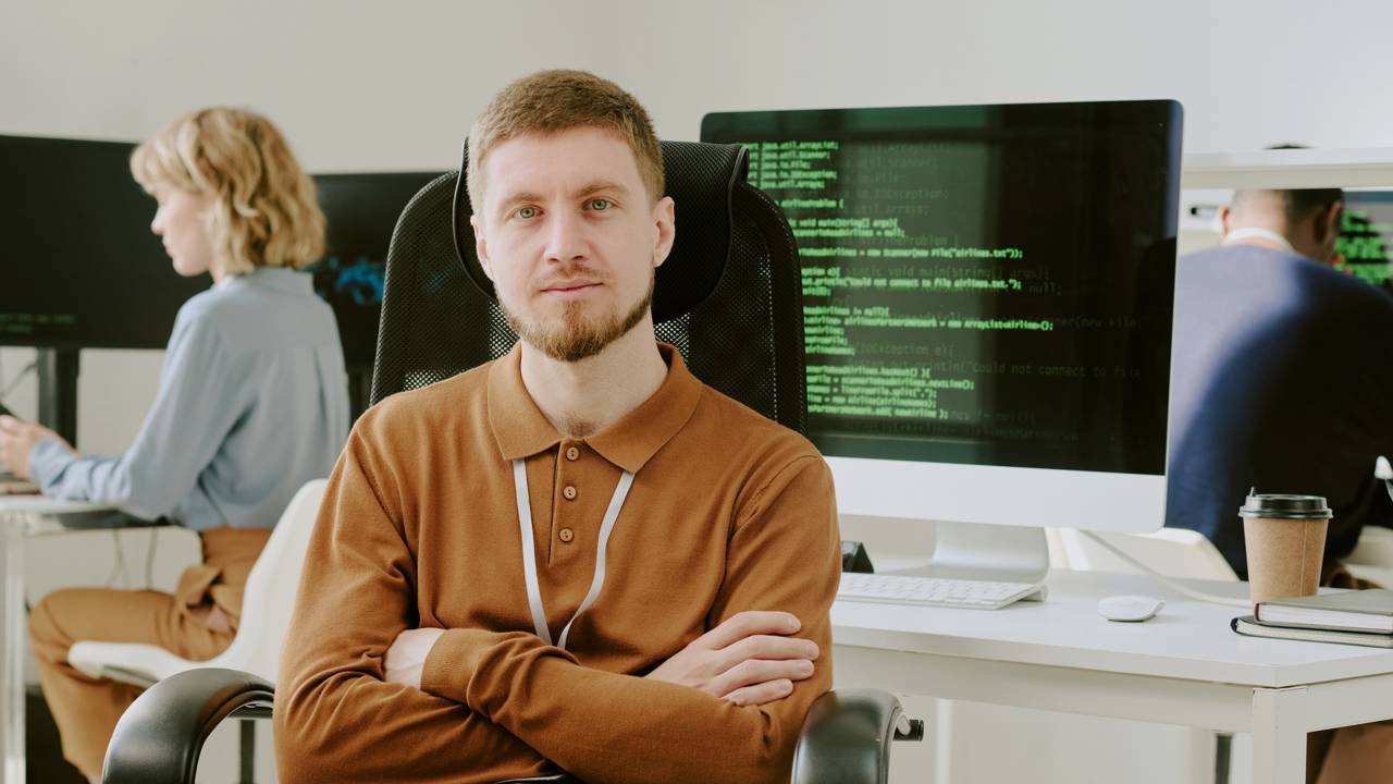 Plano médio de um jovem programador caucasiano sentado com os braços cruzados em seu local de trabalho em um escritório de TI equipado com computadores modernos - Créditos: depositphotos.com / annas.stills.gmail.com