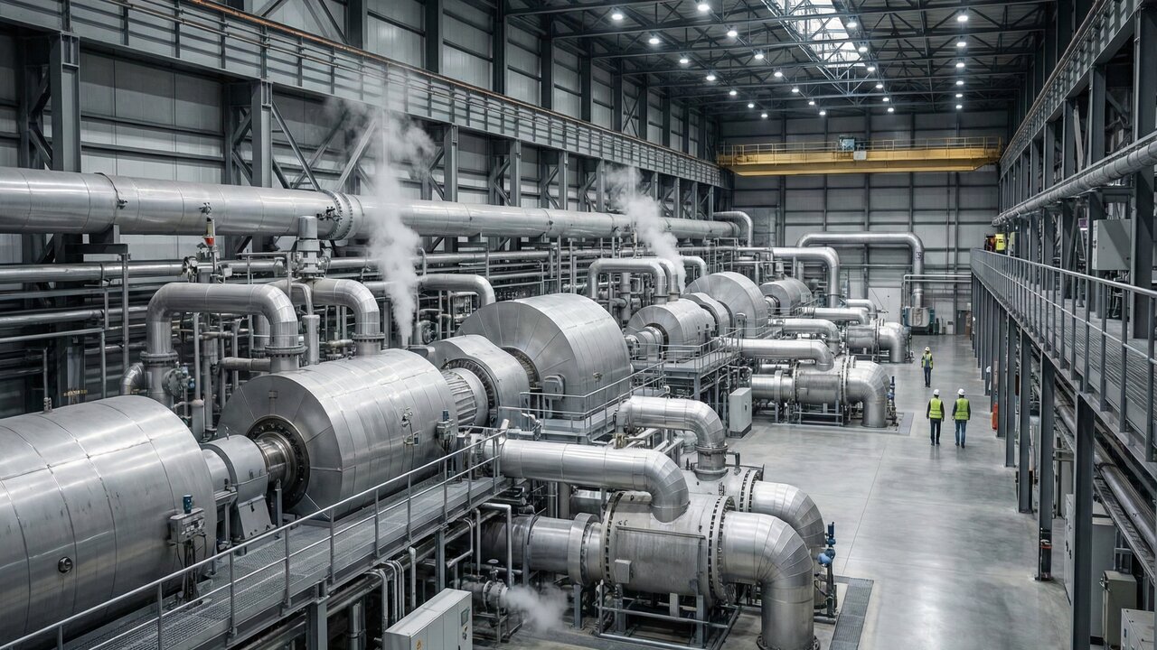Para isso, o vapor passa por um condensador, um trocador de calor gigante onde é resfriado até virar água. Em seguida, uma bomba de múltiplos estágios eleva a pressão dessa água e a envia de volta à caldeira, reiniciando o ciclo infinito de evaporação e condensação.