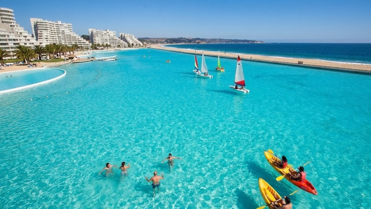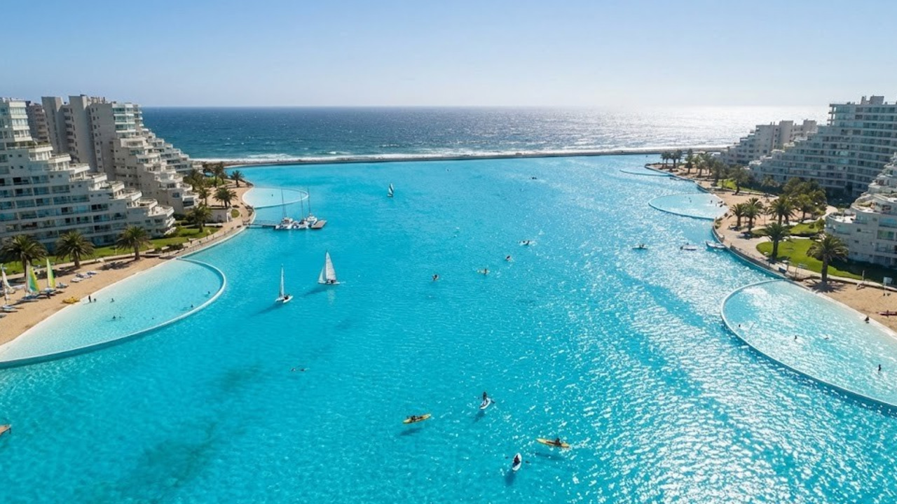 A maior piscina do mundo: lagoa artificial no Chile tem 1 km de extensão, usa água do mar filtrada e permite até navegar de barco à vela