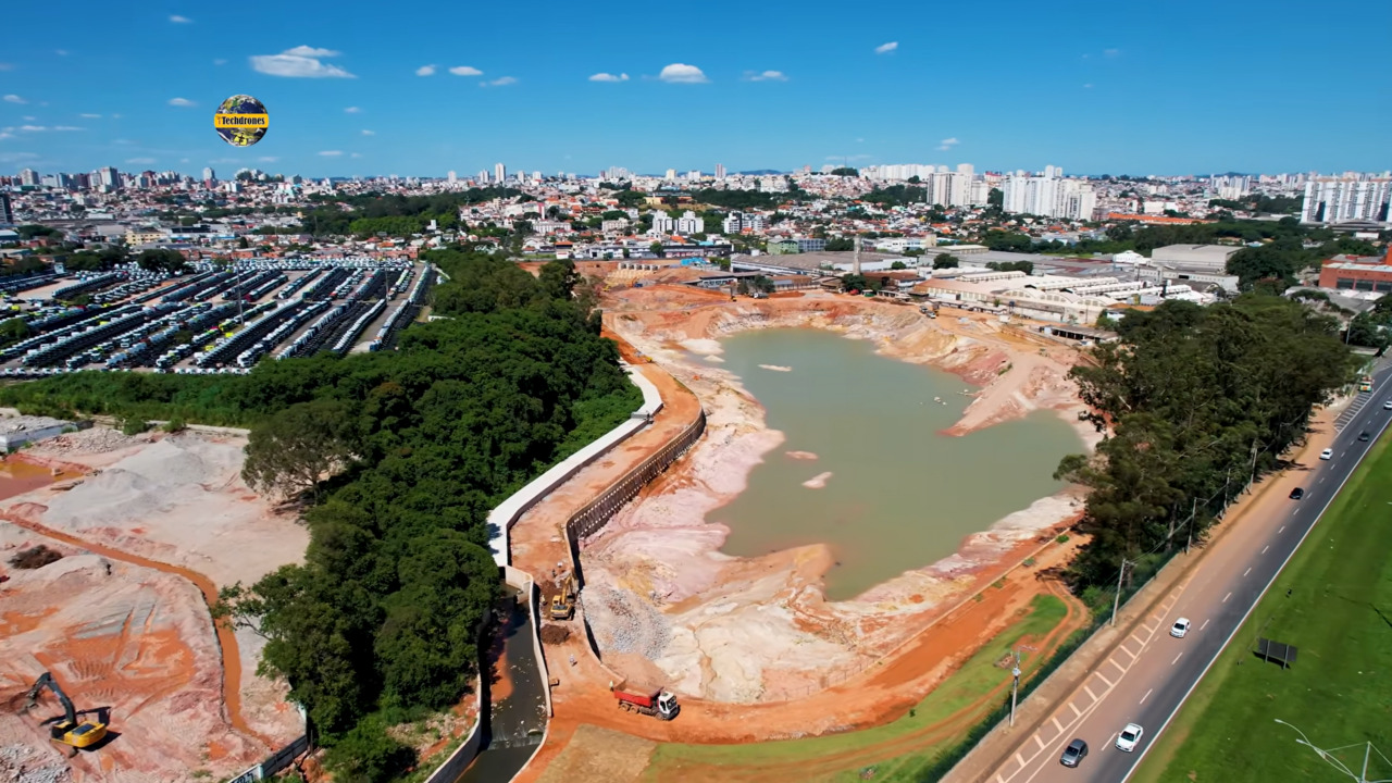 A escala do Reservatório Jaboticabal é difícil de compreender apenas com números; a vista aérea revela a verdadeira dimensão da intervenção no tecido urbano. O canal iTechdrones, especialista em acompanhamento de grandes obras e com mais de 110 mil inscritos, registrou imagens impressionantes que mostram a estrutura em detalhes: