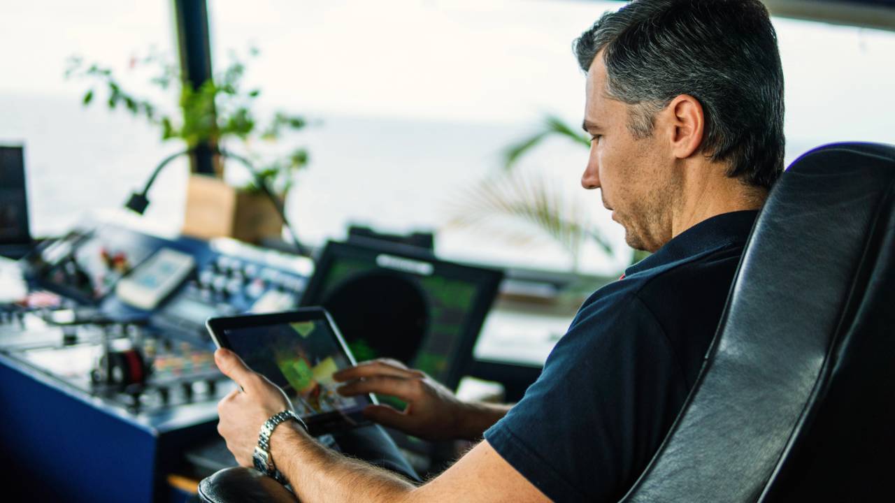 Oficial chefe na ponte de comando observando um tablet digital – Créditos: depositphotos.com / igor.kardasov.gmail.com