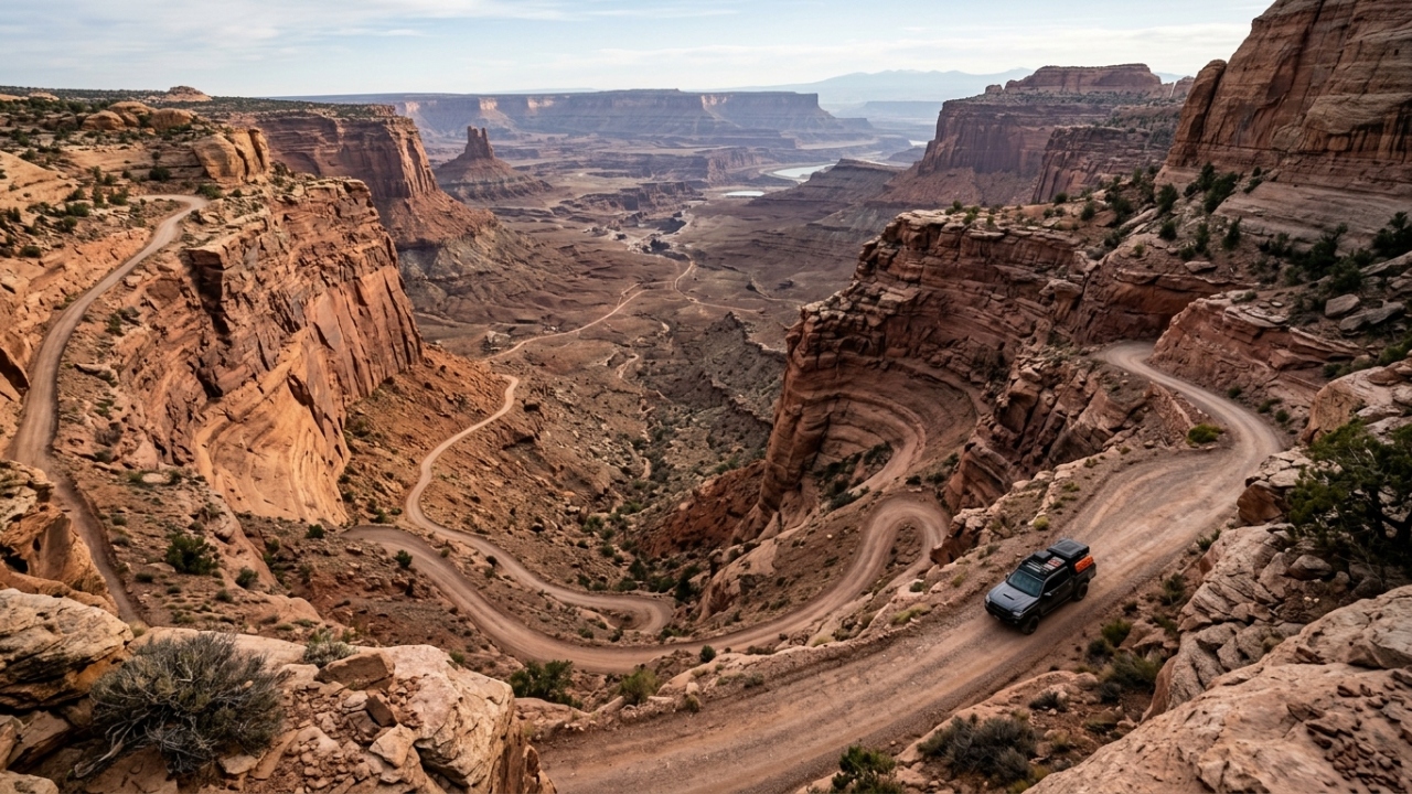 Para explorar um dos roteiros off-road mais impressionantes de Utah, escolhemos o conteúdo do canal The West is Big! Explore It. No vídeo a seguir, o viajante registra a descida emocionante pela Shafer Trail, enfrentando curvas acentuadas e revelando vistas espetaculares dos cânions: