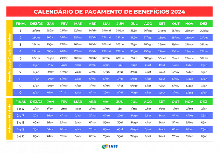 O Benefício de Prestação Continuada (BPC) é pago mensalmente e no valor de um salário mínimo (R$ 1. 320 atualmente). Os depósitos são realizados de acordo com as datas de pagamento das aposentadorias e pensões do INSS. Para 2024, o INSS estabeleceu dois cronogramas: um para os segurados com benefício até um salário mínimo e outro que começa uma semana depois, destinado para quem recebe valores acima do piso nacional. O calendário do BPC acompanha as datas de quem recebe o piso previdenciário do INSS, liberando os valores conforme o dígito final do benefício.