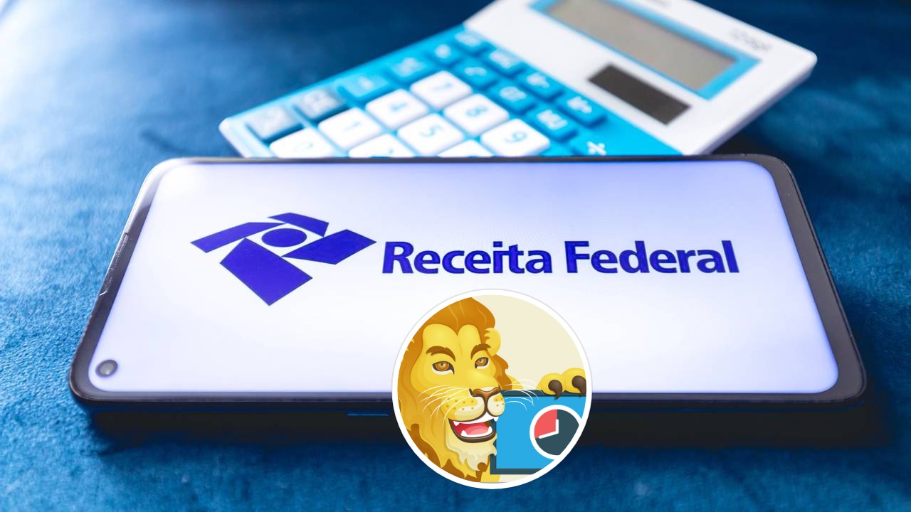 Brasília, Distrito Federal - Brasil. 2022. Aplicativo da Receita Federal na tela do smartphone e O leão - Conceito famoso do Imposto de Renda brasileiro - Créditos: depositphotos.com / imagetico - Créditos: depositphotos.com / rmcarvalhobsb