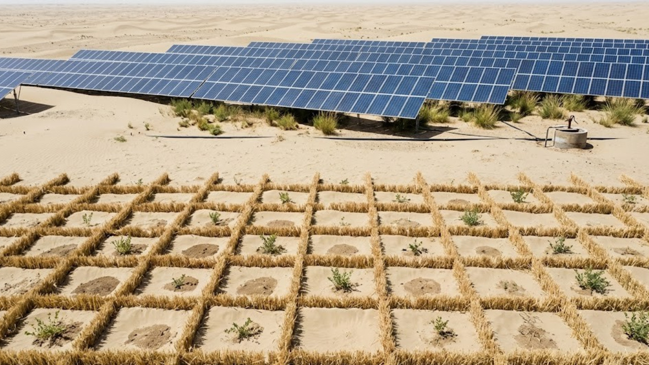 A inovação não parou na palha. No deserto de Kubuqi e ao longo do Taklamakan, a China implementou o conceito de controle de areia fotovoltaico. Imensos campos de painéis solares funcionam como barreiras de vento artificiais, reduzindo a evaporação do solo e permitindo que plantas cresçam na sombra das placas.