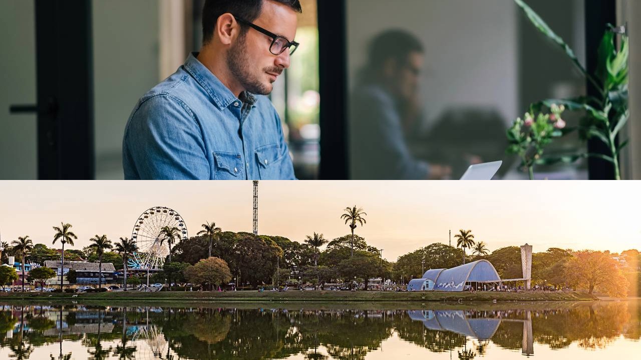 Belo Horizonte, Minas Gerais, Brasil. Vista do Lago da Pampulha ao pôr do sol e Jovem empresário ou empreendedor sério, pensativo e concentrado, em um ambiente descontraído no escritório, olhando e trabalhando com um laptop, digitando e escrevendo um e-mail comercial importante - Créditos: depositphotos.com / MoonSafari - Créditos: depositphotos.com / paulobaqueta