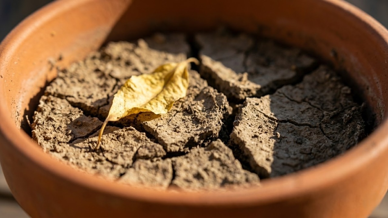 A terra ressecada retrai e cria fendas largas que impedem a absorção de nutrientes no futuro. Raízes frágeis expostas ao ar quente morrem em poucos dias, tornando a recuperação do vegetal quase impossível após um período prolongado de seca extrema no ambiente doméstico.
