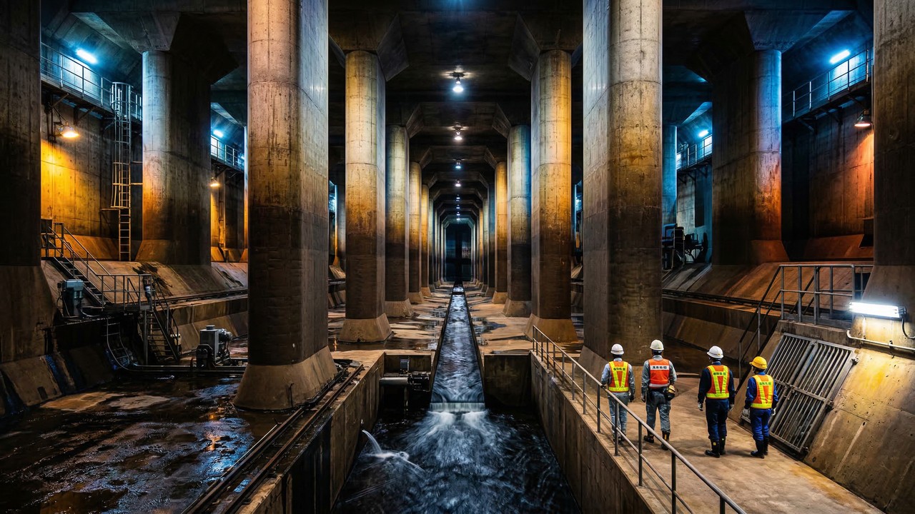 A peça central contra enchentes é o sistema G-Cans, um reservatório monumental situado a 50 metros de profundidade. Conhecido como “catedral subterrânea”, ele drena águas de tufões e as bombeia para o oceano, evitando que os rios transbordem no centro.